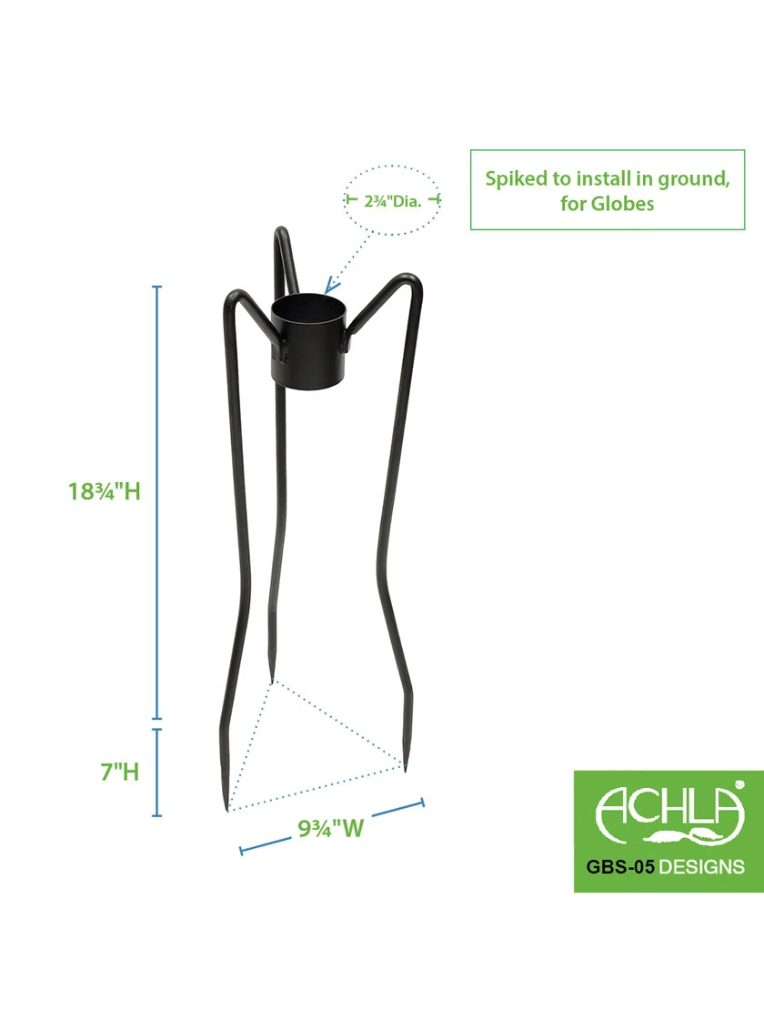 Popularized in the Victorian era, the mirrored finish of the Gazing Ball provided a fish-eye view of the entire garden and was believed to fend off misfortune and deliver happiness and joy. A striking ornament in the garden, usually made of blown glass, gazing globes need a stand to keep them secure and on view. These simple spiked stands will securely hold the gazing globe when staked into the ground. All Achla Designs Gazing Globes have a stem that rests in the tubular section at the top of the stand, ensuring the globe will stay seated in place. Designed to work with any Achla Designs Gazing Globes, in 6”, 10”, or 12” diameter.